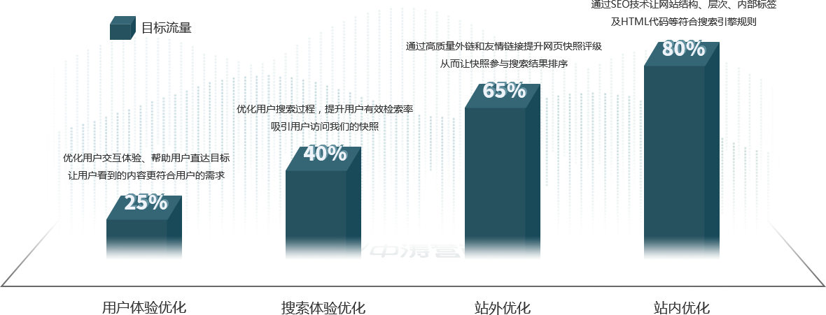 整站優化不以單個關鍵詞排名好壞論英雄,考核的是進入搜索引擎首頁或前三名的詞量及網站整體的目標搜索量。
